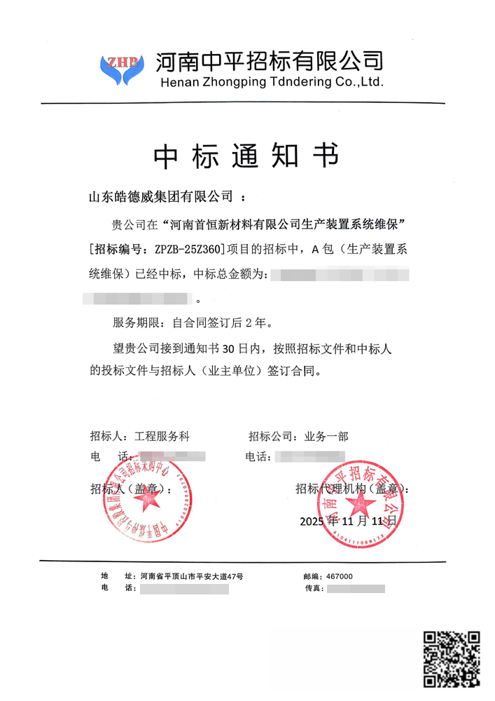恭喜公司中标河南首恒新材料有限公司生产装置系统维保工程